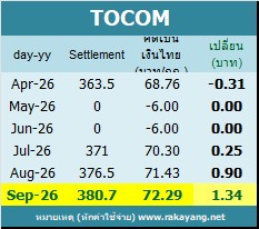 ราคาปิดตลาด TOCOM-RSS3 ช่วง Day Session ประจำวัน จันทร์ ที่ 30 มีนาคม 2569ก.ย.-2026 เพิ่มขึ้น 6.5เยน Settle อยู่ที่ 380.70เยน ปริมาณ 228 สัญญา