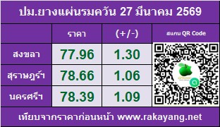 ราคาประมูลแผ่นรมควัน: ตลาดสงขลา 77.96 บาท/กก.  ราคาเพิ่มขึ้น 1.30 บาท/กก.   ปริมาณยาง   29,319 กก.